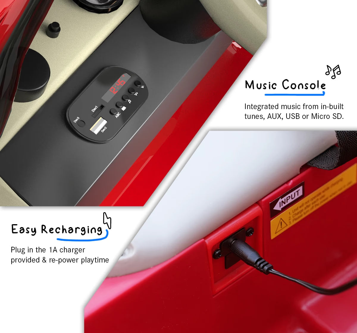 Integrated Music: The built-in music controls on the dashboard and steering wheel allow children to enjoy their favourite tunes while cruising.