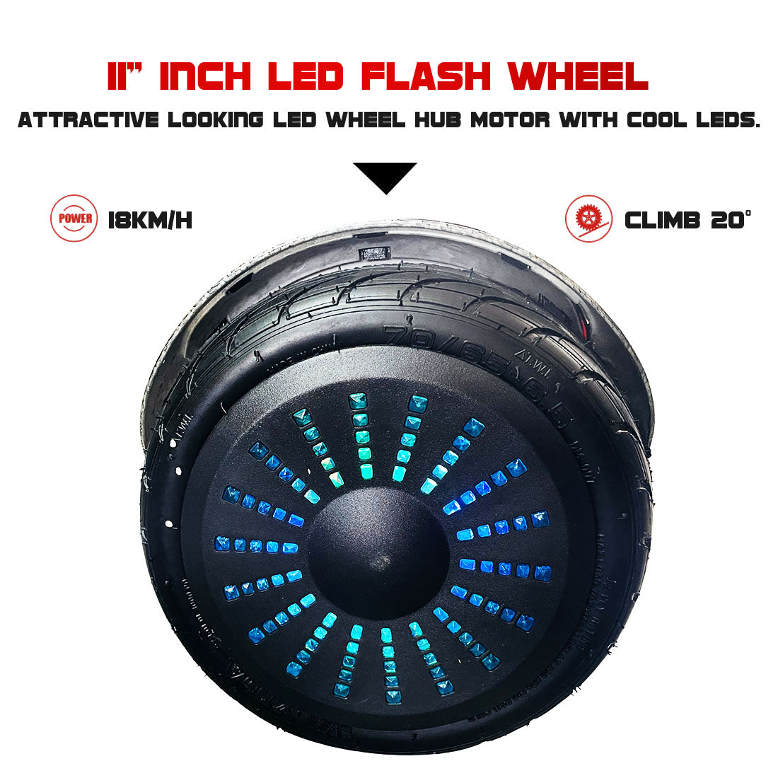 The H11 Hoverboard is the Ultimate Beast with large 11″ inflatable tires. It provides the smoothest ride over cracks and bumps. It offers almost 2X the power and can travel up to 18km/h with the ability to climb slopes up to 30 degrees. Like all our models it also has built-in Bluetooth and LED lights.. When put head to head with even the most expensive Hoverboard brands, the H11 has been rated #1 in both safety & durability. The hypersensitive gyro-sensors with START UP Balance 2.0 make it an excellent choice for smaller riders while enabling it to turn on a dime for full-sized riders (unlike other brands with a lag in responsiveness causing the rider to fall off). Zoom effortlessly indoors & out across all types of terrain and integrated LED lights & Bluetooth 4.0 so you can pump your music & light up the night as you ride!