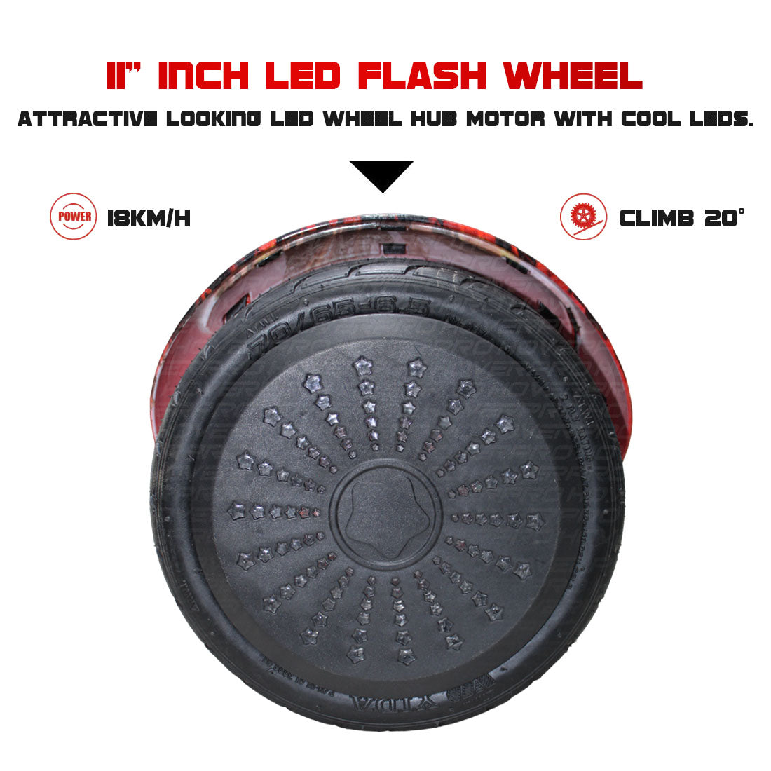 The H11 Hoverboard is the Ultimate Beast with large 11″ inflatable tires. It provides the smoothest ride over cracks and bumps. It offers almost 2X the power and can travel up to 18km/h with the ability to climb slopes up to 30 degrees. Like all our models it also has built-in Bluetooth and LED lights.. When put head to head with even the most expensive Hoverboard brands, the H11 has been rated #1 in both safety & durability. The hypersensitive gyro-sensors with START UP Balance 2.0 make it an excellent choice for smaller riders while enabling it to turn on a dime for full-sized riders (unlike other brands with a lag in responsiveness causing the rider to fall off). Zoom effortlessly indoors & out across all types of terrain and integrated LED lights & Bluetooth 4.0 so you can pump your music & light up the night as you ride!