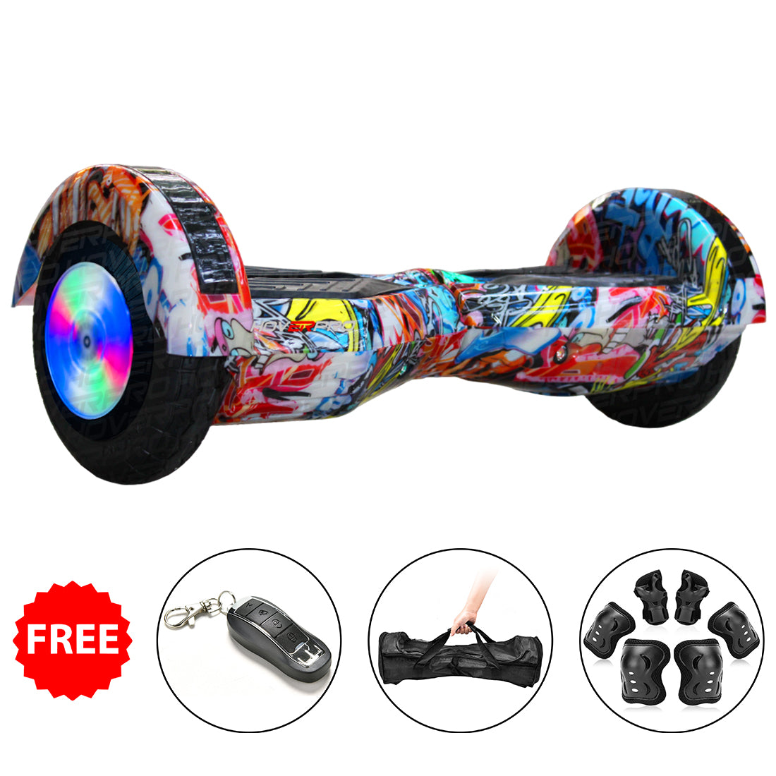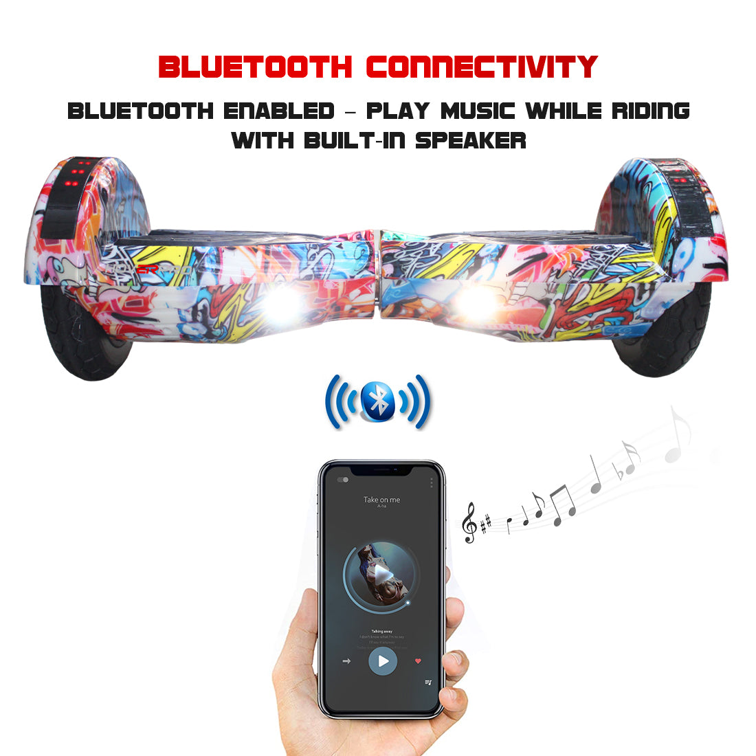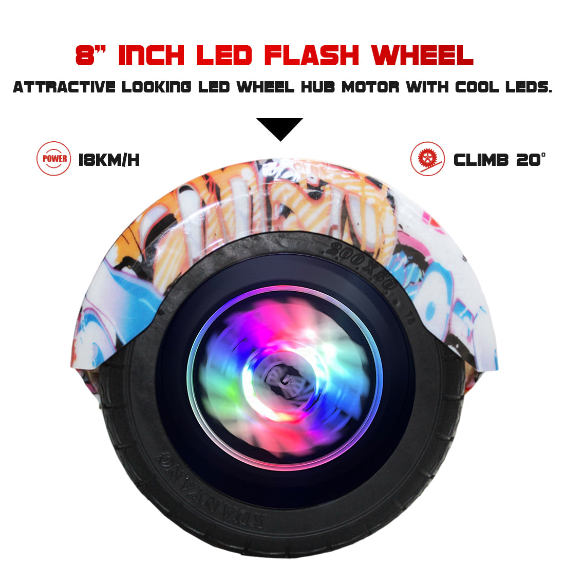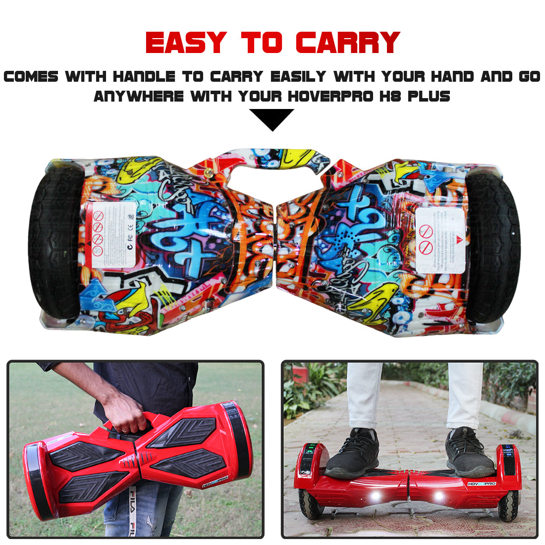 Our H8 Hoverboard performs better outdoors over rougher terrain due to the larger 8″ wheel diameter and more powerful motors. Like all our models it also has built-in Bluetooth and LED lights.. When put head to head with even the most expensive Hoverboard brands, the H8 has been rated #1 in both safety & durability. The hypersensitive gyro-sensors with START-UP Balance 2.0 make it an excellent choice for smaller riders while enabling it to turn on a dime for full-sized riders (unlike other brands with a lag in responsiveness causing the rider to fall off). Zoom effortlessly indoors & out across all types of flat terrain and integrated LED lights, Alloy Wheels & Bluetooth 4.0 so you can pump your music & light up the night as you ride!
