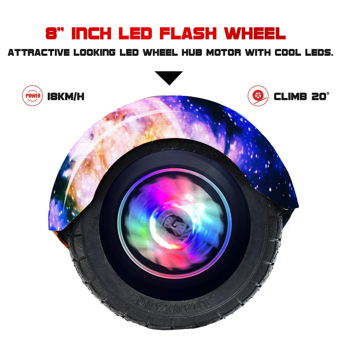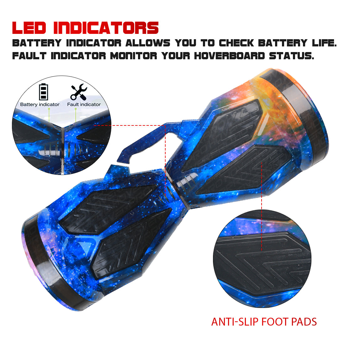 Our H8 Hoverboard performs better outdoors over rougher terrain due to the larger 8″ wheel diameter and more powerful motors. Like all our models it also has built-in Bluetooth and LED lights.. When put head to head with even the most expensive Hoverboard brands, the H8 has been rated #1 in both safety durability. The hypersensitive gyro-sensors with START-UP Balance 2.0 make it an excellent choice for smaller riders while enabling it to turn on a dime for full-sized riders (unlike other brands with a lag in responsiveness causing the rider to fall off). Zoom effortlessly indoors out across all types of flat terrain and integrated LED lights, Led Wheels Bluetooth 4.0 so you can pump your music light up the night as you ride!