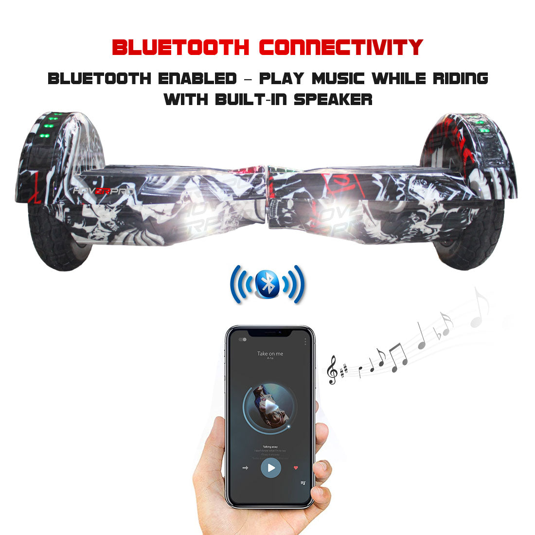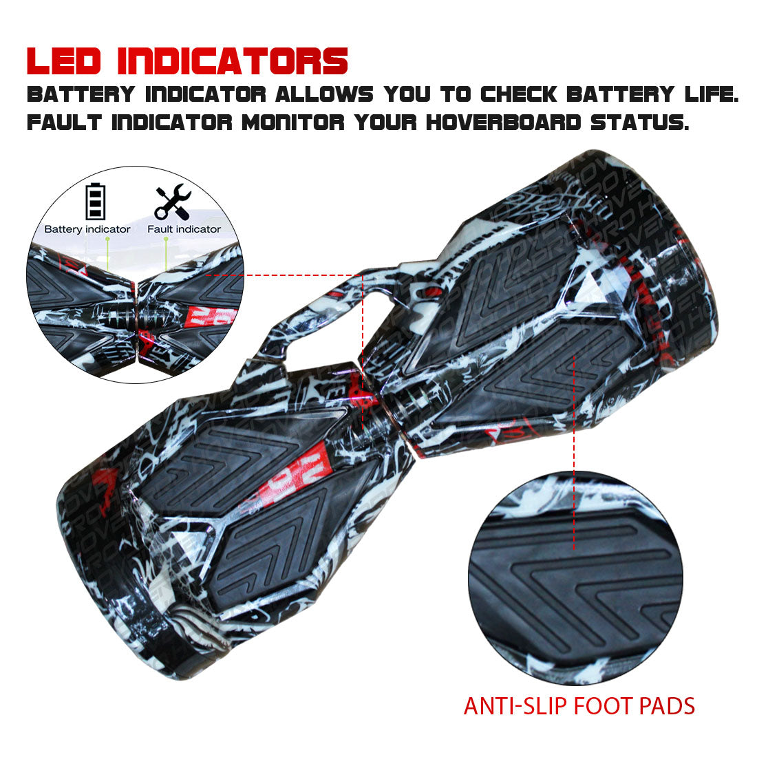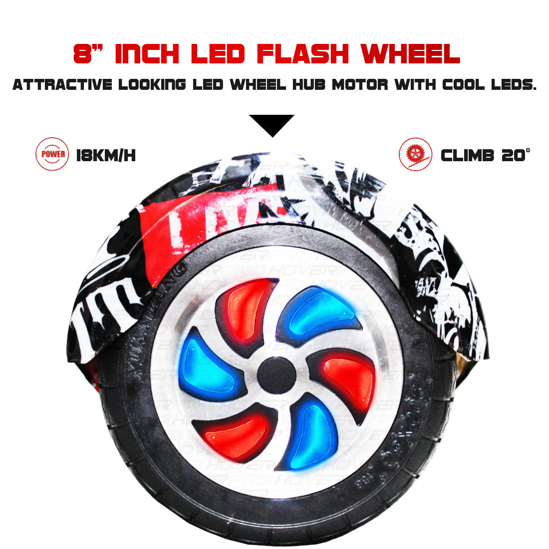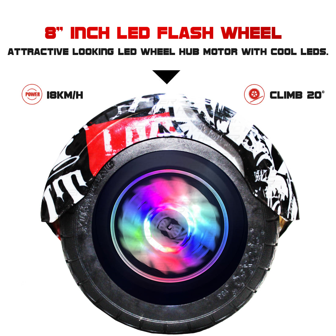 Our H8 Hoverboard performs better outdoors over rougher terrain due to the larger 8″ wheel diameter and more powerful motors. Like all our models it also has built-in Bluetooth and LED lights.. When put head to head with even the most expensive Hoverboard brands, the H8 has been rated #1 in both safety durability. The hypersensitive gyro-sensors with START-UP Balance 2.0 make it an excellent choice for smaller riders while enabling it to turn on a dime for full-sized riders (unlike other brands with a lag in responsiveness causing the rider to fall off). Zoom effortlessly indoors out across all types of flat terrain and integrated LED lights, Led Wheels Bluetooth 4.0 so you can pump your music light up the night as you ride!